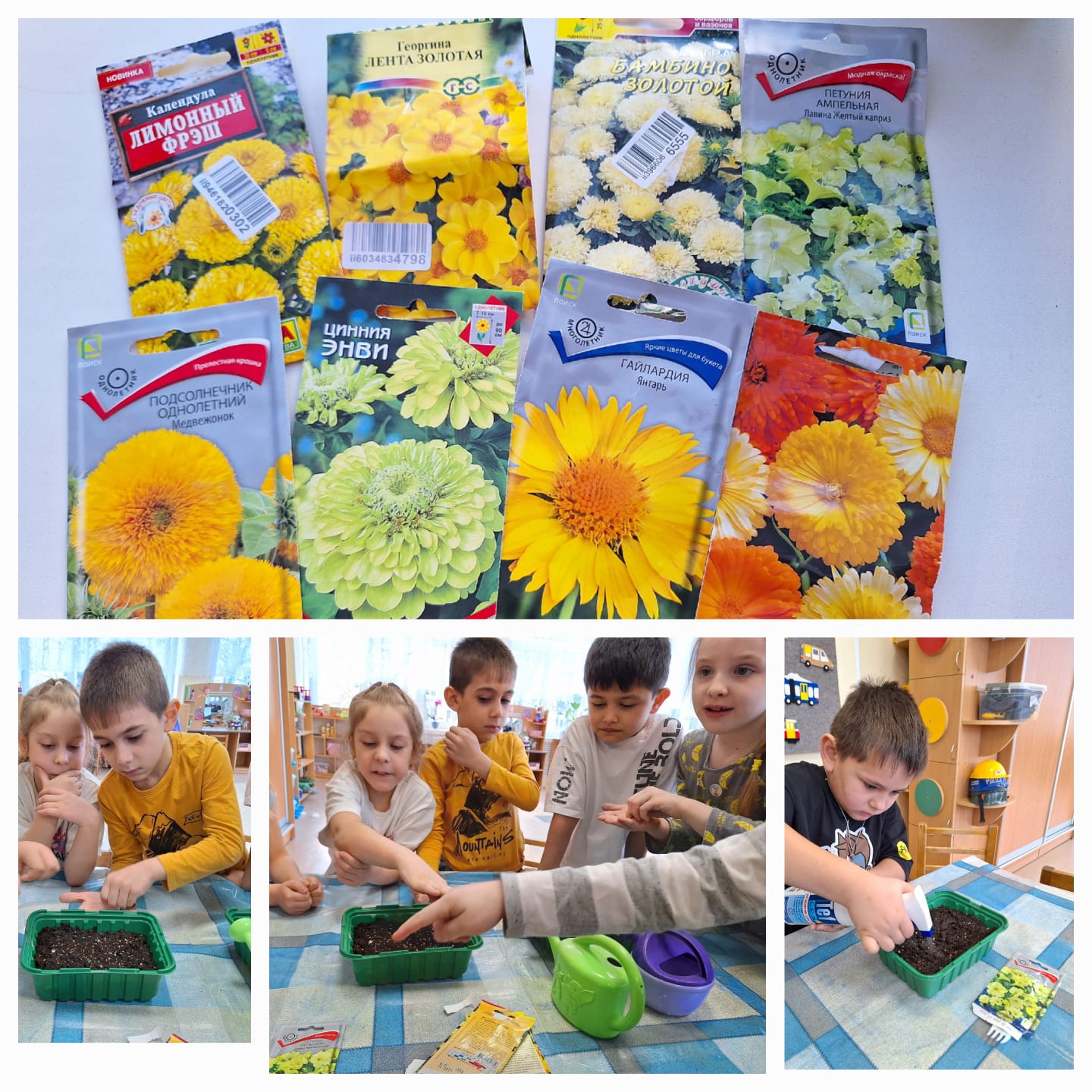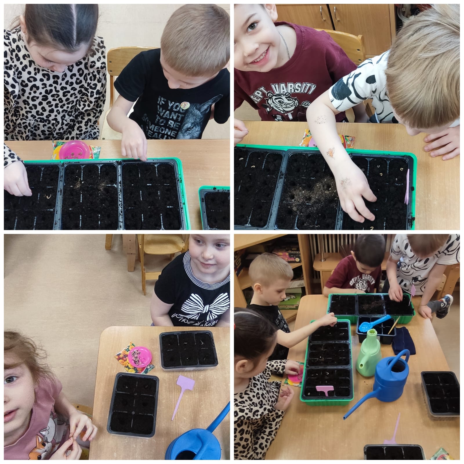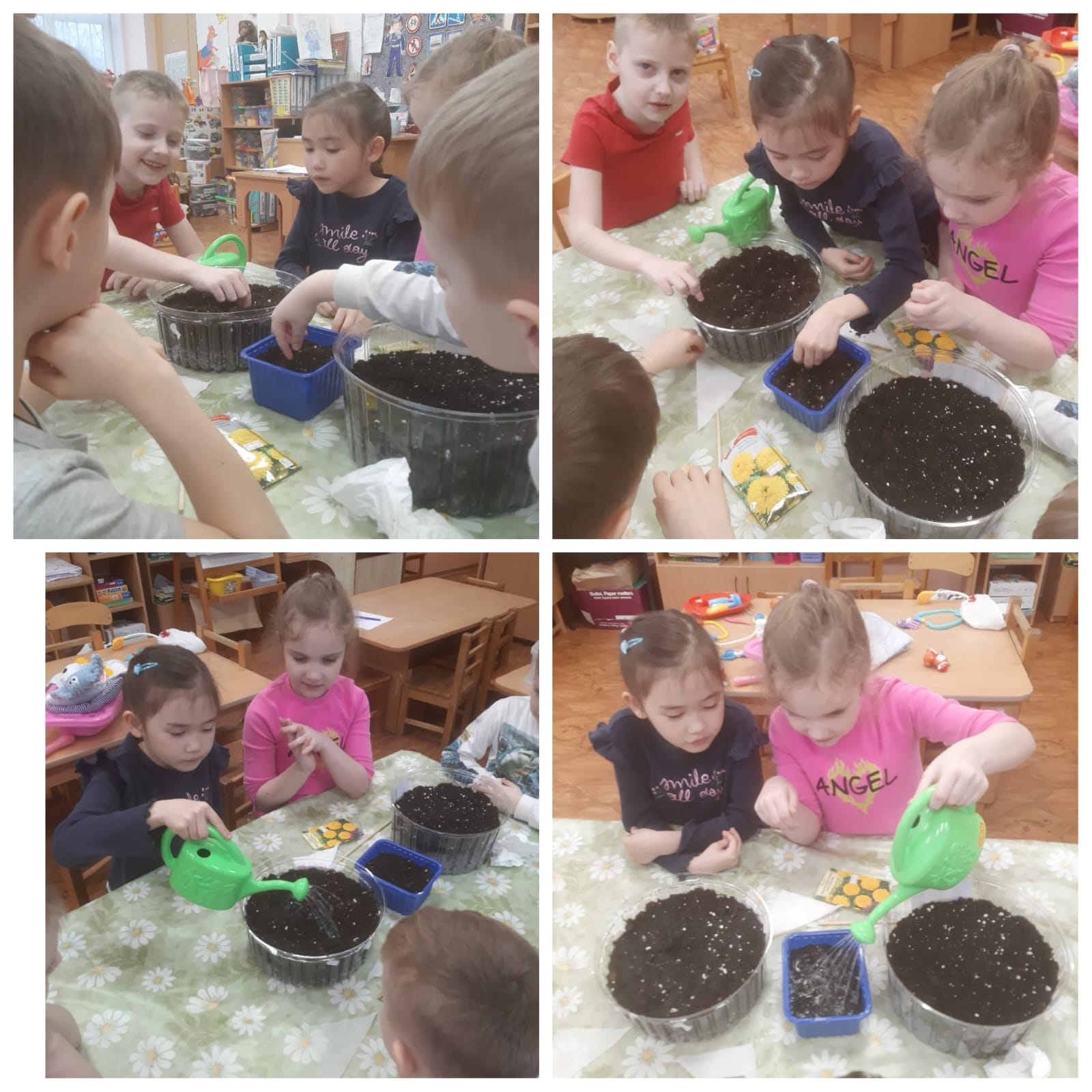 4 группа "Смешарики" вместе с детьми произвели отбор семян, подготовили тару, посеяли семена. С большим интересом осуществляют уход за будущими цветами. На данное время поливают и опрыскивают землю.