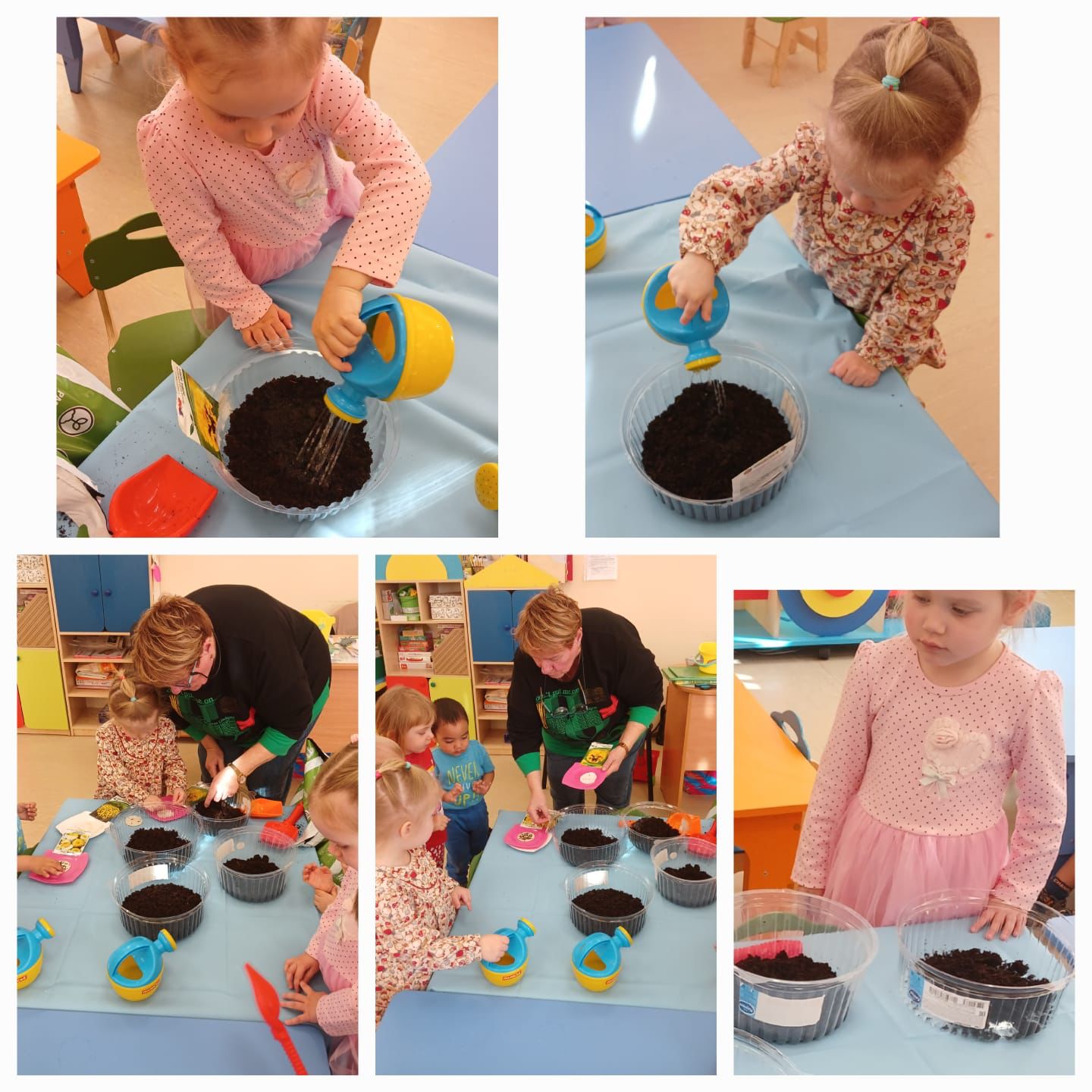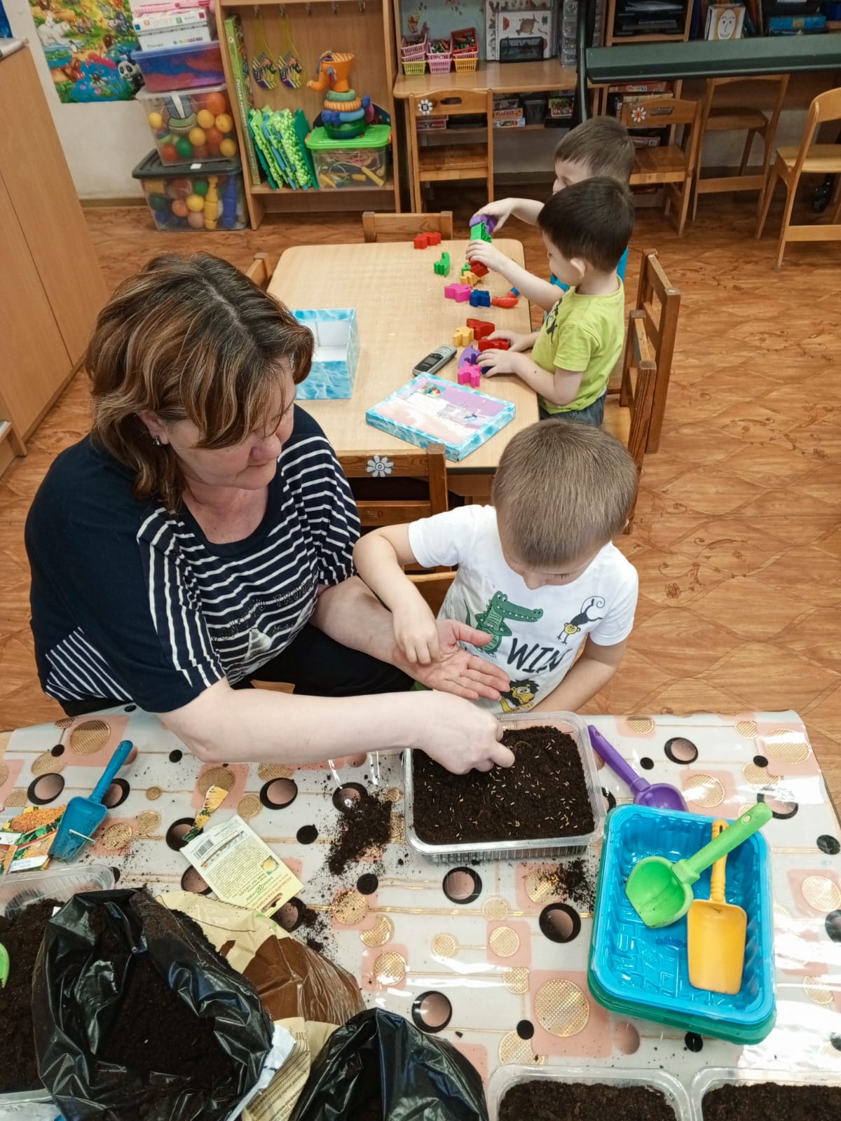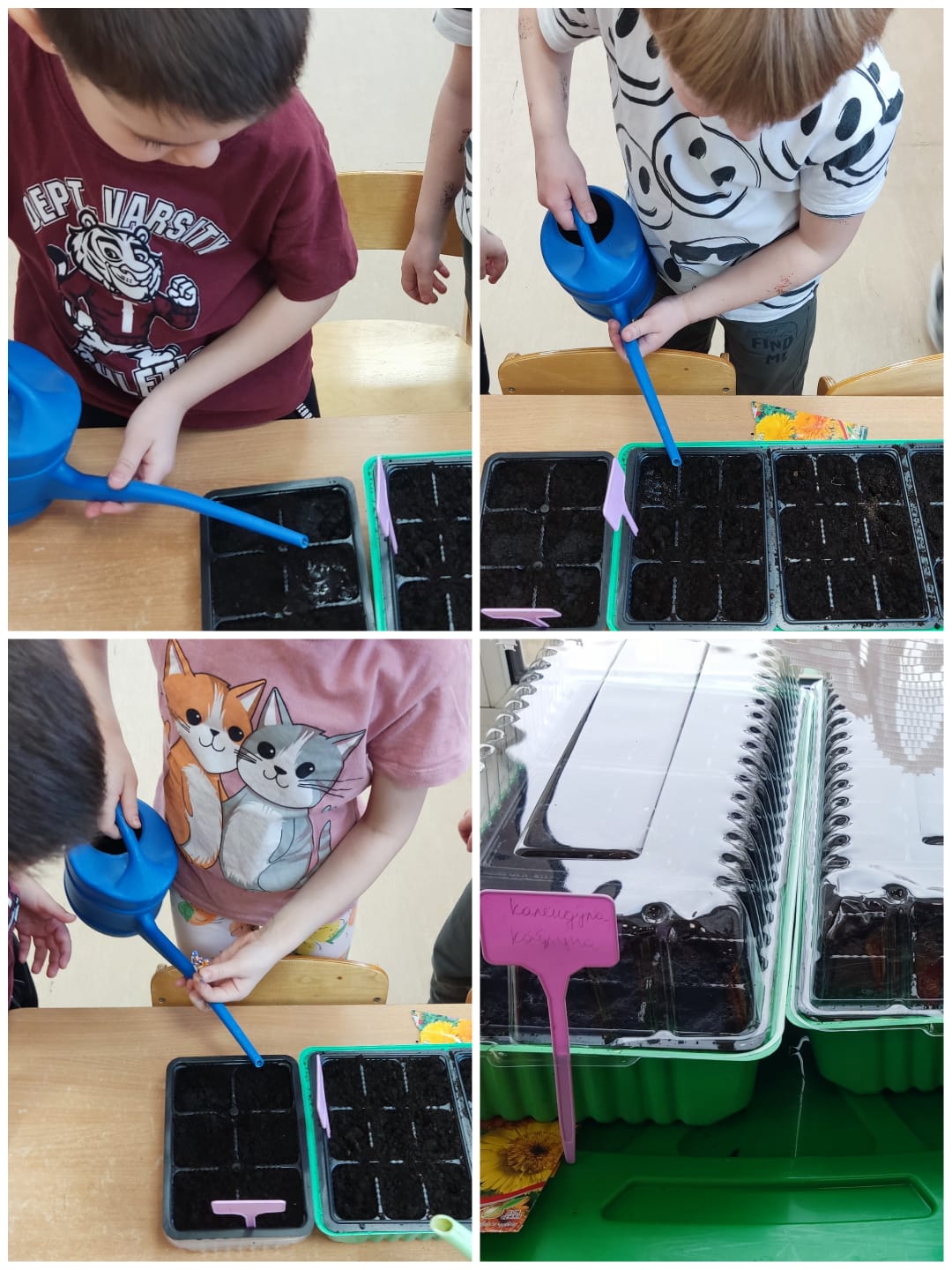4 группа "Смешарики" вместе с детьми произвели отбор семян, подготовили тару, посеяли семена. С большим интересом осуществляют уход за будущими цветами. На данное время поливают и опрыскивают землю.