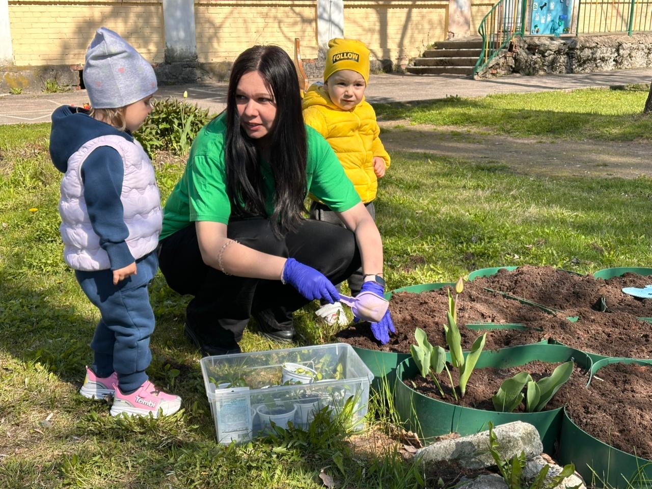 Наши малыши из группы №12 "Непоседы" первыми начали высаживать свою рассаду в клумбы.